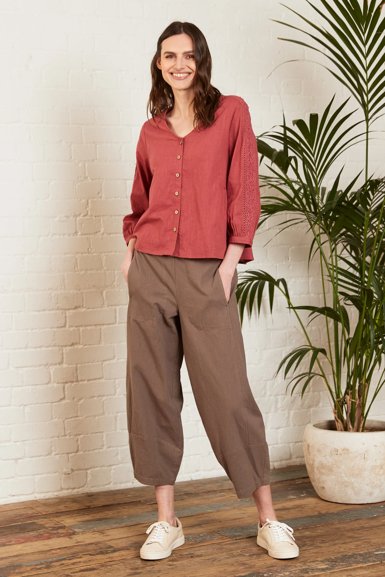 A beautiful lace trim shirt in classic white and summery raspberry, with 3/4 sleeves and biodegradable coconut buttons. This dainty shirt is crafted from 100% cotton slub, with gathered cuffs for that extra detail. Team with our range of twisted cotton trousers for an easy 9-5 outfit.