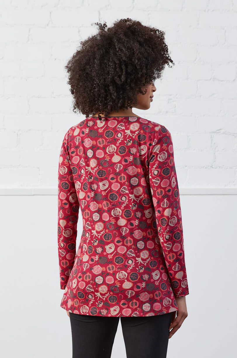 A go-to, long sleeve jersey top with a single patch pocket and contrasting neckline. In two sumptuous colours, navy and crimson, and printed in our exclusive Pomegranate design, this 100% organic cotton jersey piece is one you will reach for over and over.