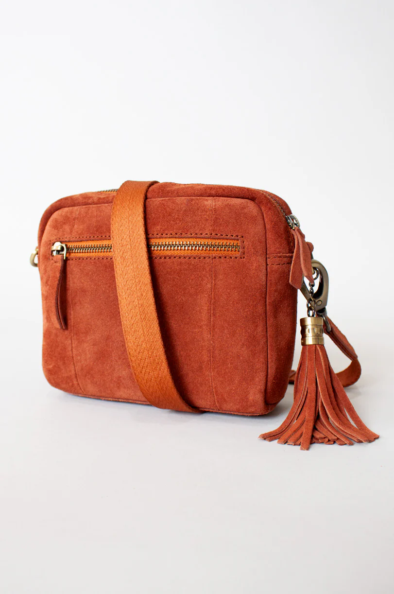 Finish off your outfit with our beautiful suede crossbody bag, available in peacock and tiger. The bag features zip closures, inside pockets, cotton lining and brass metal trims. You may want to apply some suede waterproofing spray to this design to protect the integrity of the fabric against the rain. Our bags are produced in India using LWG Gold rated suede, as well as low-impact dye, to minimise pollution and waste.